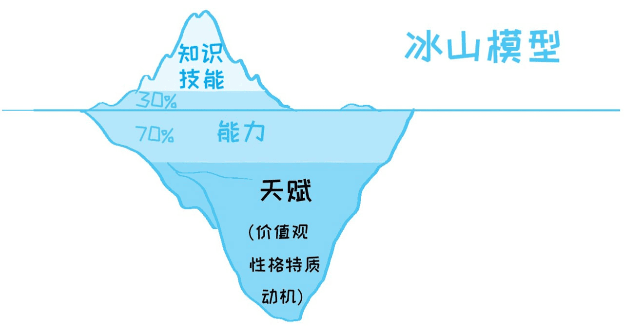 我们之前提到的冰山模型有很多研究表明冰山下面的天赋部分60%以上的程度决定了一个人能够创造的价值。