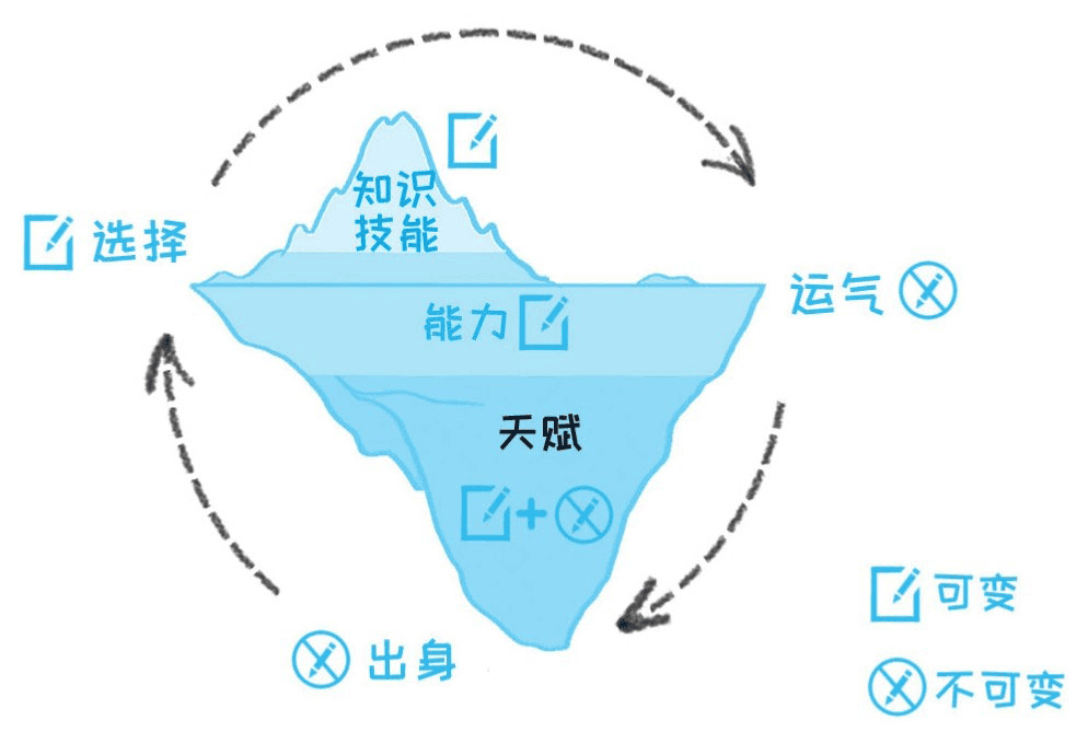 复杂一点的是天赋和选择。天赋本身几乎不能改变,但是你可以通过挖掘自己的天赋,选择与之匹配的工作。从而最大化地利用它。所以,我们暂且认为他是部分可变的。