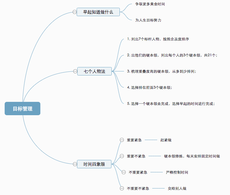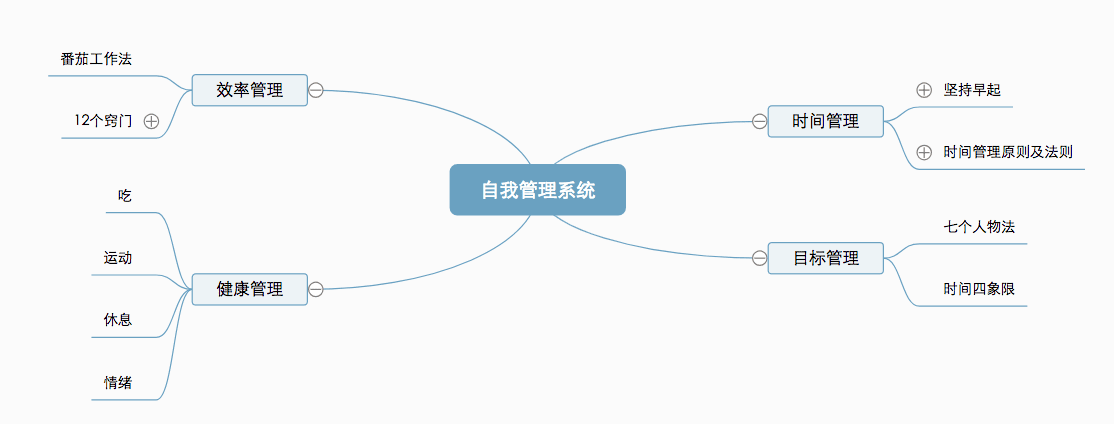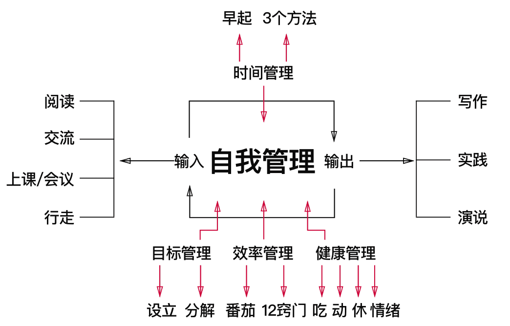 仅仅打造输入系统是没用的,还应该做好自我管理。有的时候我们太忽略了自我管理,更强调团队管理。实际上一个人如果不能管理好自己,不能更加自律的话,是不能实现效率人生的。构建自我管理需要注意四个方面:时间管理、目标管理、效率管理和健康管理。