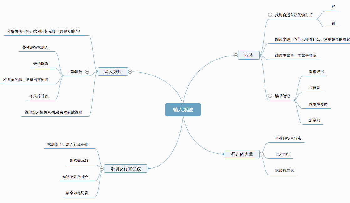 输入系统就是每年为自己构造一套老师的学习体系,第二就是我们需要确定自己的阅读目的,然后再开始自己的阅读计划。此外,还有培训班和行业会议,你可以从中获得圈子当中的有效信息,最后一点就是如何能够通过行走感知书本与人交谈培训班行业会议不能感知的力量,这就是输入体系。