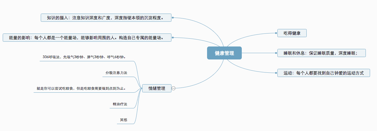 这就要求我们长期保持良好的作息时间、经常锻炼身体和科学的饮食管理。但是健康管理除了身体板块还有一个非常重要而且经常受人忽视的部分,就叫做情绪管理,情绪管理非常重要。成功事业和有意的人生基础: “正确的生活方式”、“对人类行为理解”、“处理人际关系的正确方式”;如果你遵循正确的营养、身体锻炼和心态放松这三件事情,那么你就离自己的梦想不远了。