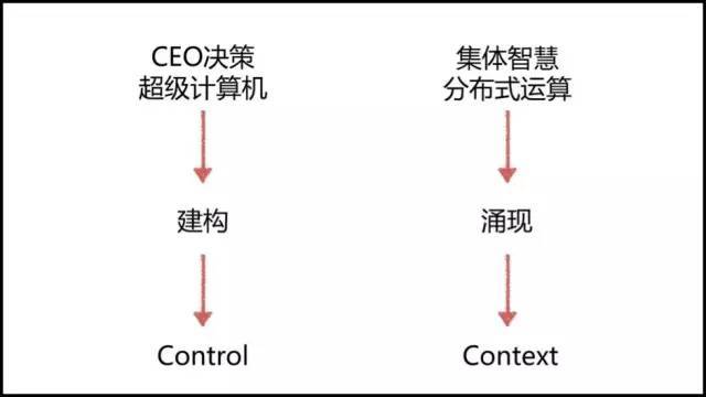 第二种,有更多的人参与决策,让更多的想法自下往上涌现出来,而不是一个从上到下的战略分解,这个过程中需要更多人基于上下文Context做出判断,而不是根据指令来执行。