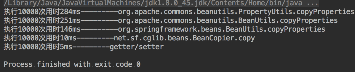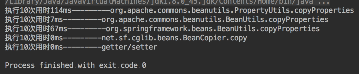 - property多,转换很频繁,为性能考虑,使用net.sf.cglib.beans.BeanCopier.BeanCopier,性能近乎getter/setter。但是BeanCopier的创建时消耗较大,所以不要频繁创建该实体,最好的处理方式是静态化或者缓存起来。