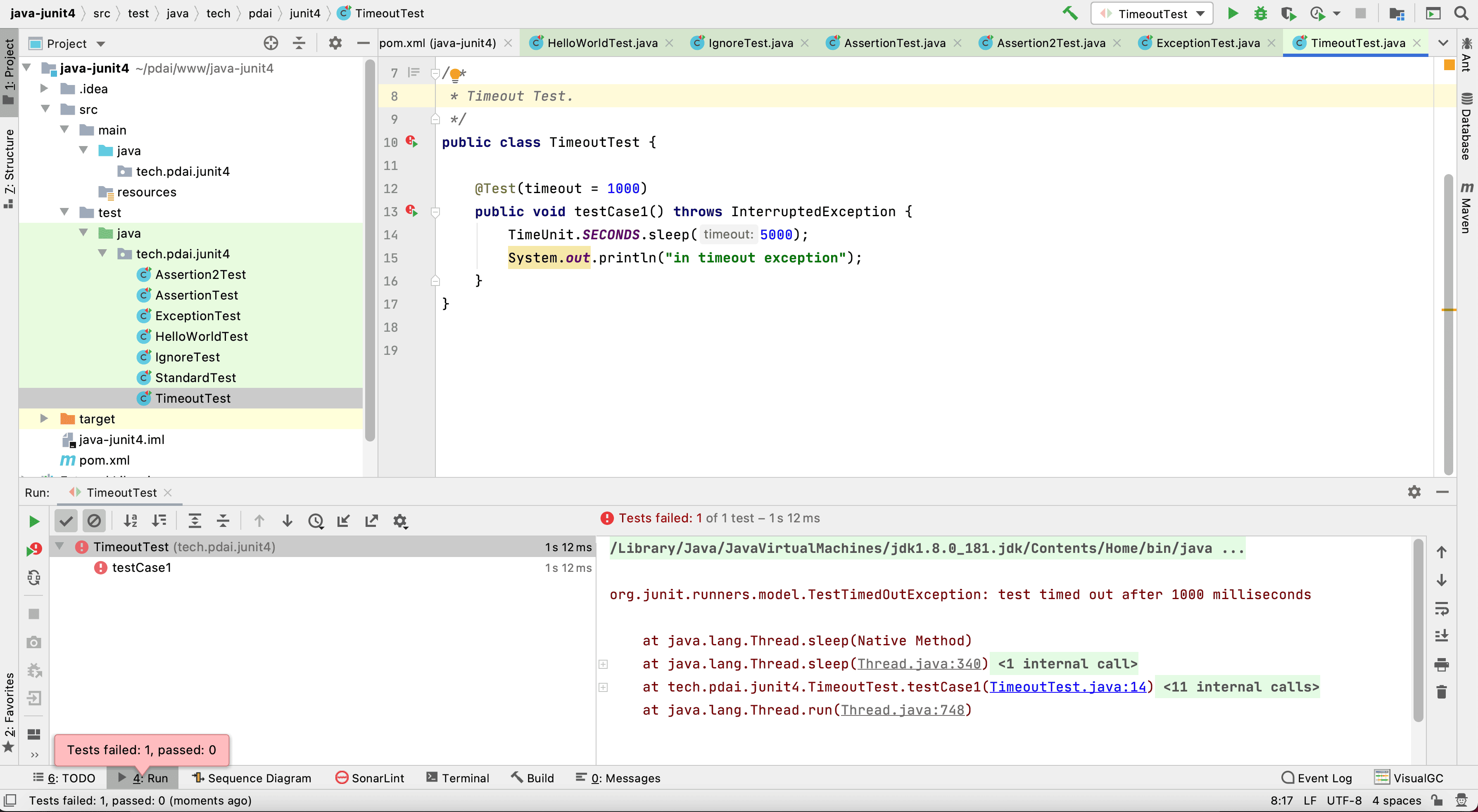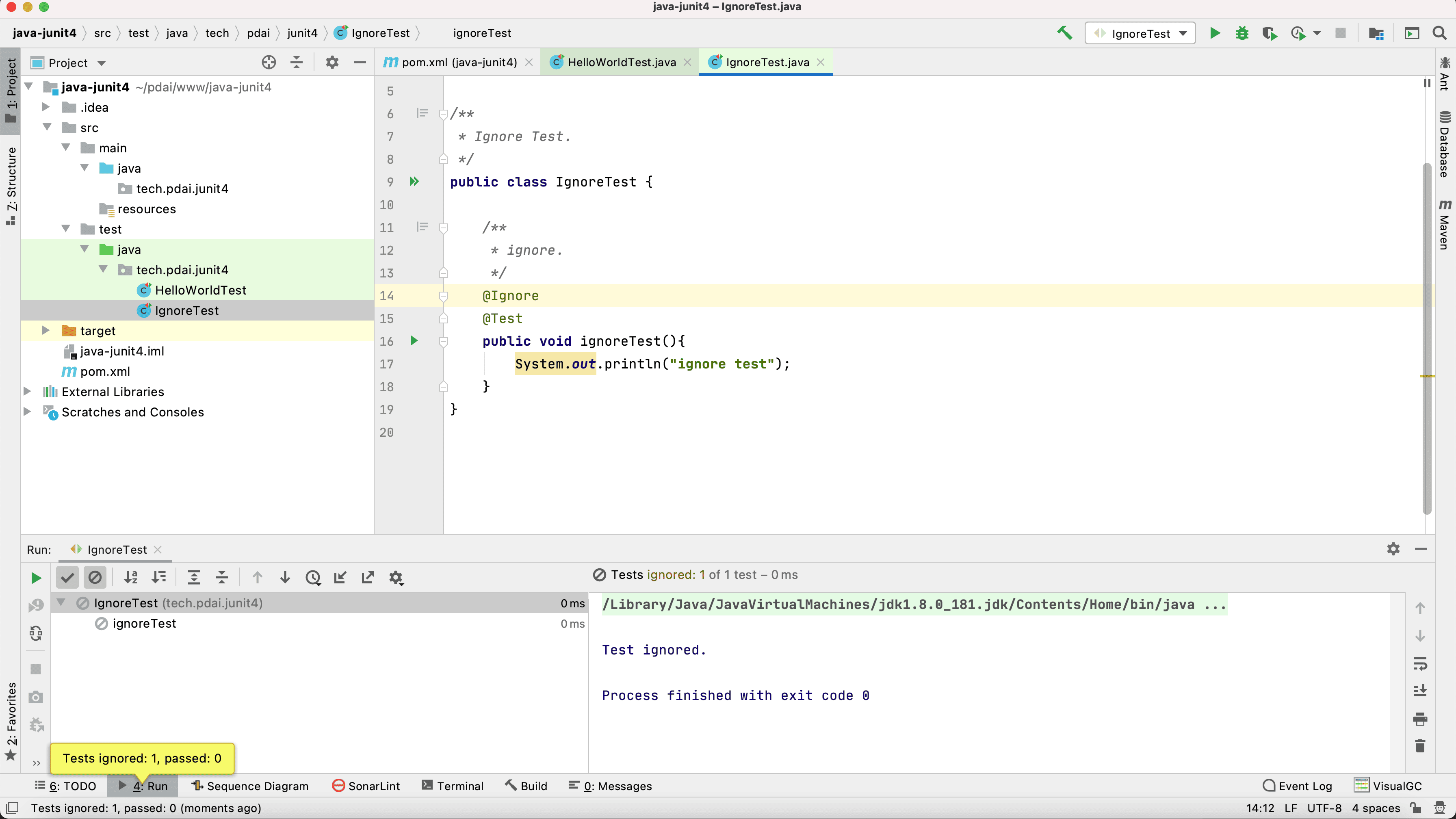 有时候我们想暂时不运行某些测试方法\测试类,可以在方法前加上这个注解。在运行结果中,junit会统计忽略的用例数,来提醒你。但是不建议经常这么做,因为这样的坏处时,容易忘记去更新这些测试方法,导致代码不够干净,用例遗漏。使用此标注的时候不能与其它标注一起使用,如:和@Test 标注一起使用,那就没用了