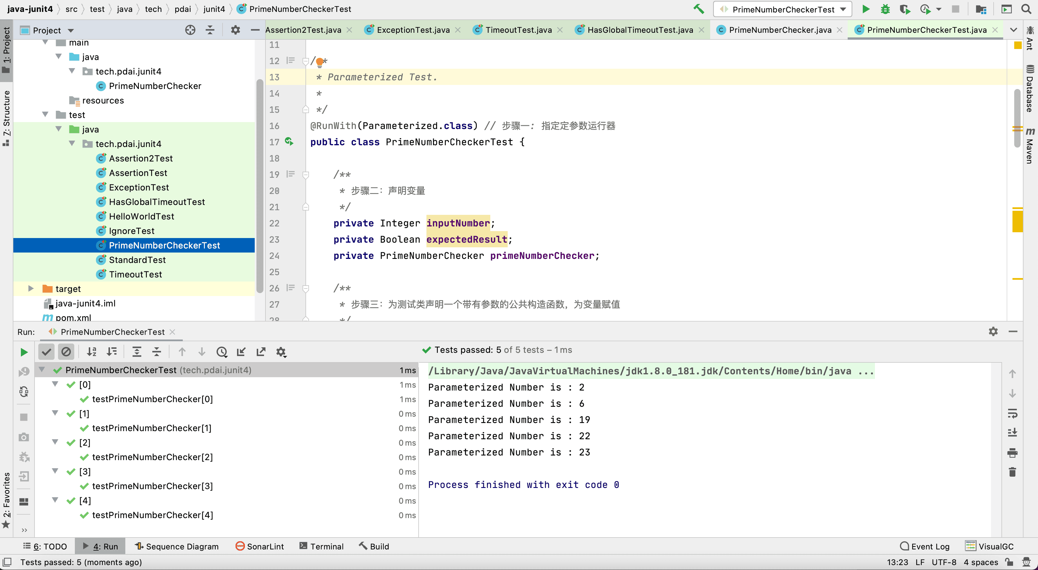 Junit 4 引入了一个新的功能参数化测试。参数化测试允许开发人员使用不同的值反复运行同 一个测试。你将遵循 5 个步骤来创建参数化测试: