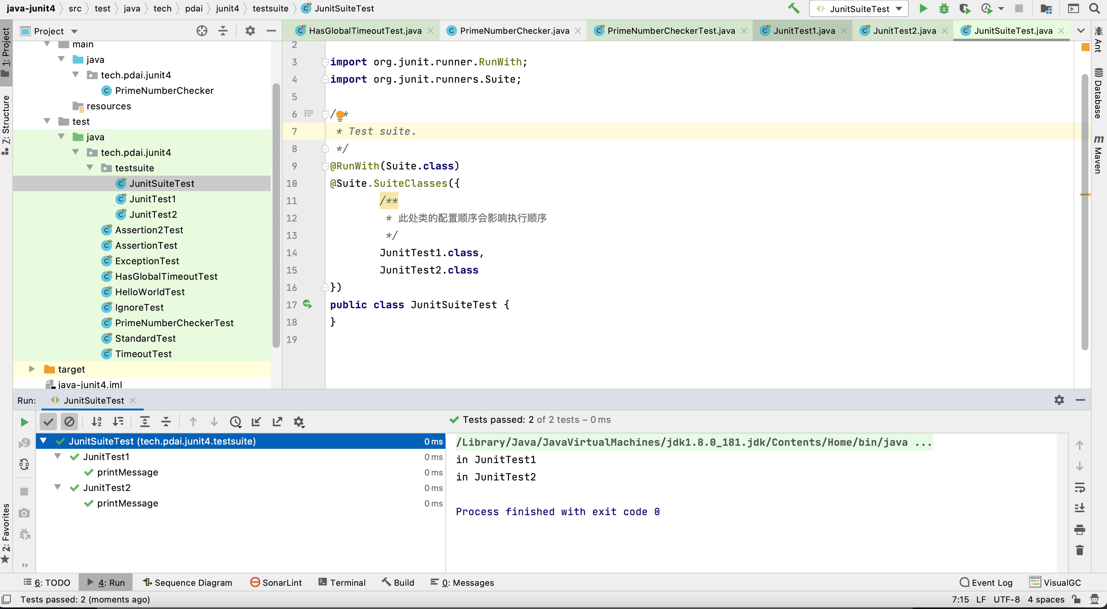 “套件测试”是指捆绑了几个单元测试用例并运行起来。在JUnit中,@RunWith 和 @Suite 这两个注解是用来运行套件测试。先来创建几个测试类