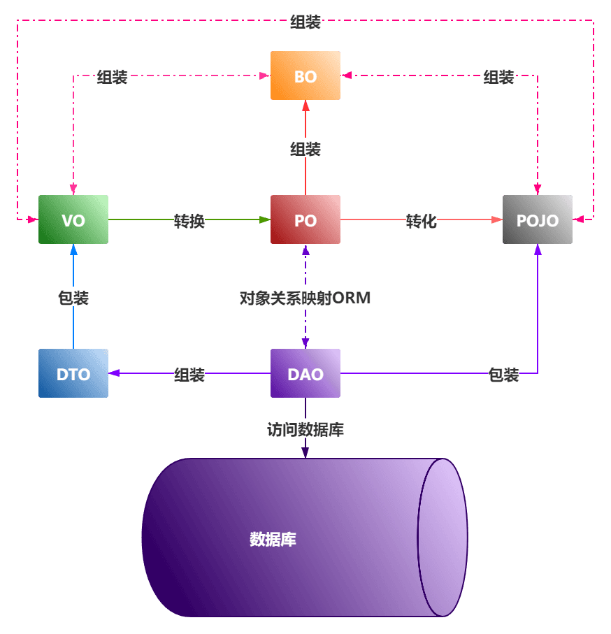 | DAO | 用于对数据库进行读写操作的类进行命名 | Data Access Object数据访问对象,主要用来封装对数据库的访问,通过DAO可以将POJO持久化为PO,也可以利用PO封装出VO和DTO |