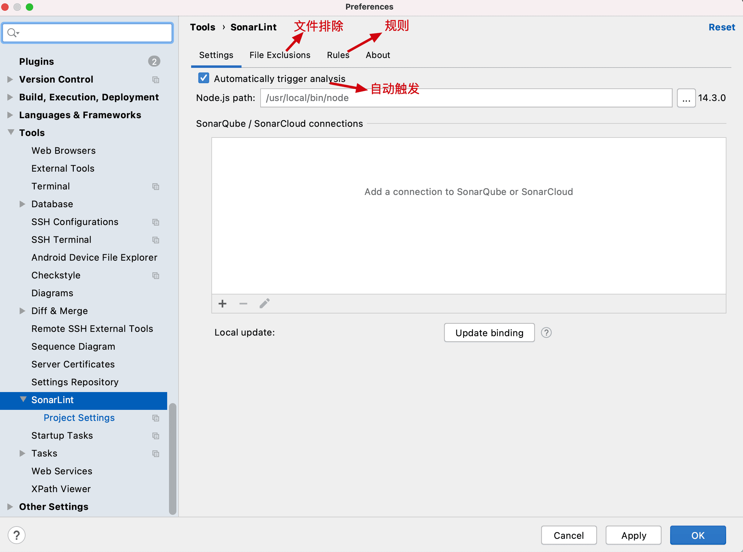除此此外还可以配置链接到Sonarqube服务器(当远程SonarQube有更新,可以点击下面的按钮Update Binding进行更新;这样可以保障团队成员使用的和最后CI环境是一套规则, 这是特别有用的,因为我们可能在服务器上禁用掉一些特例规则,然后我们可以通过这种方式同步给所有开发成员 )