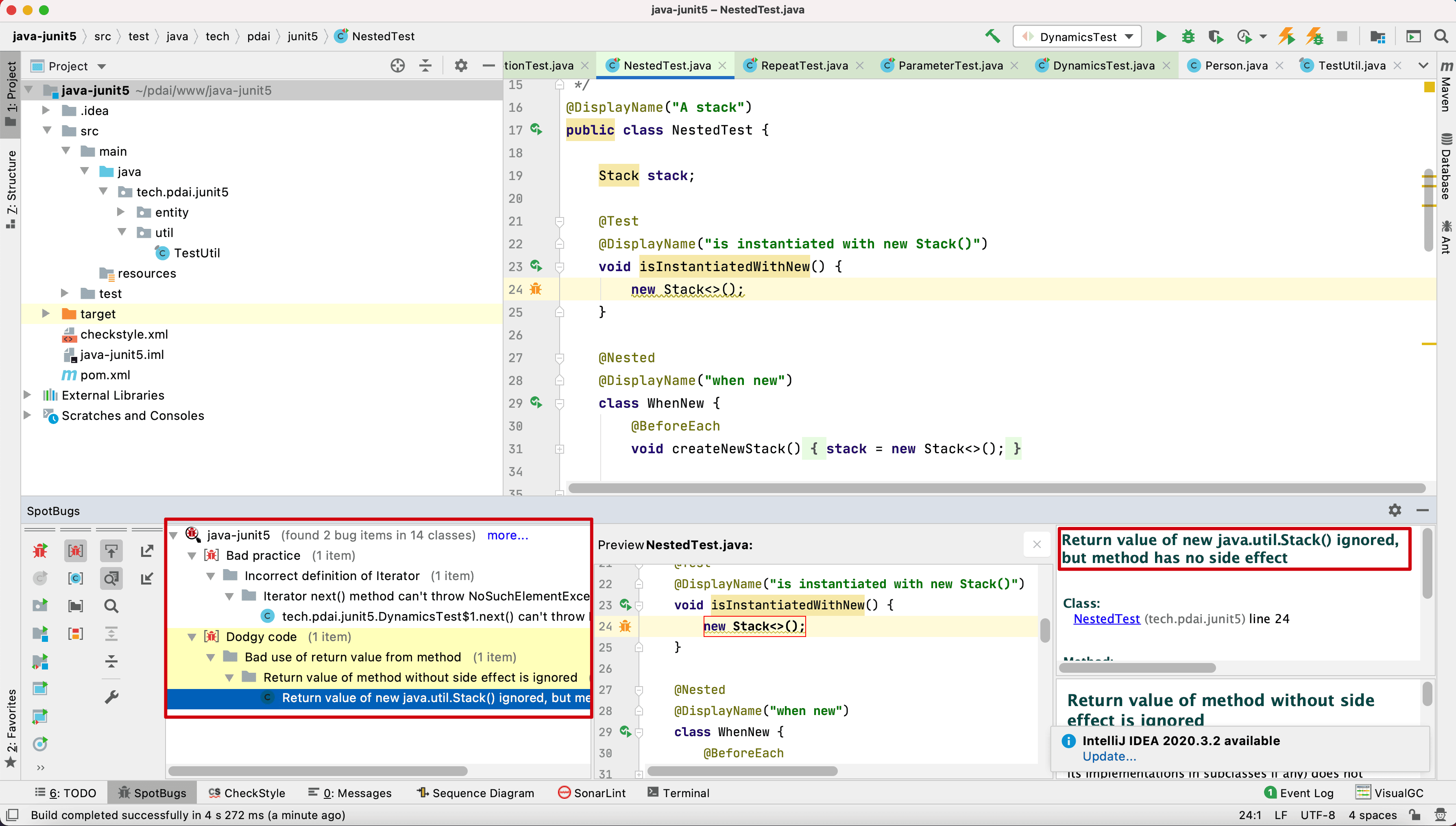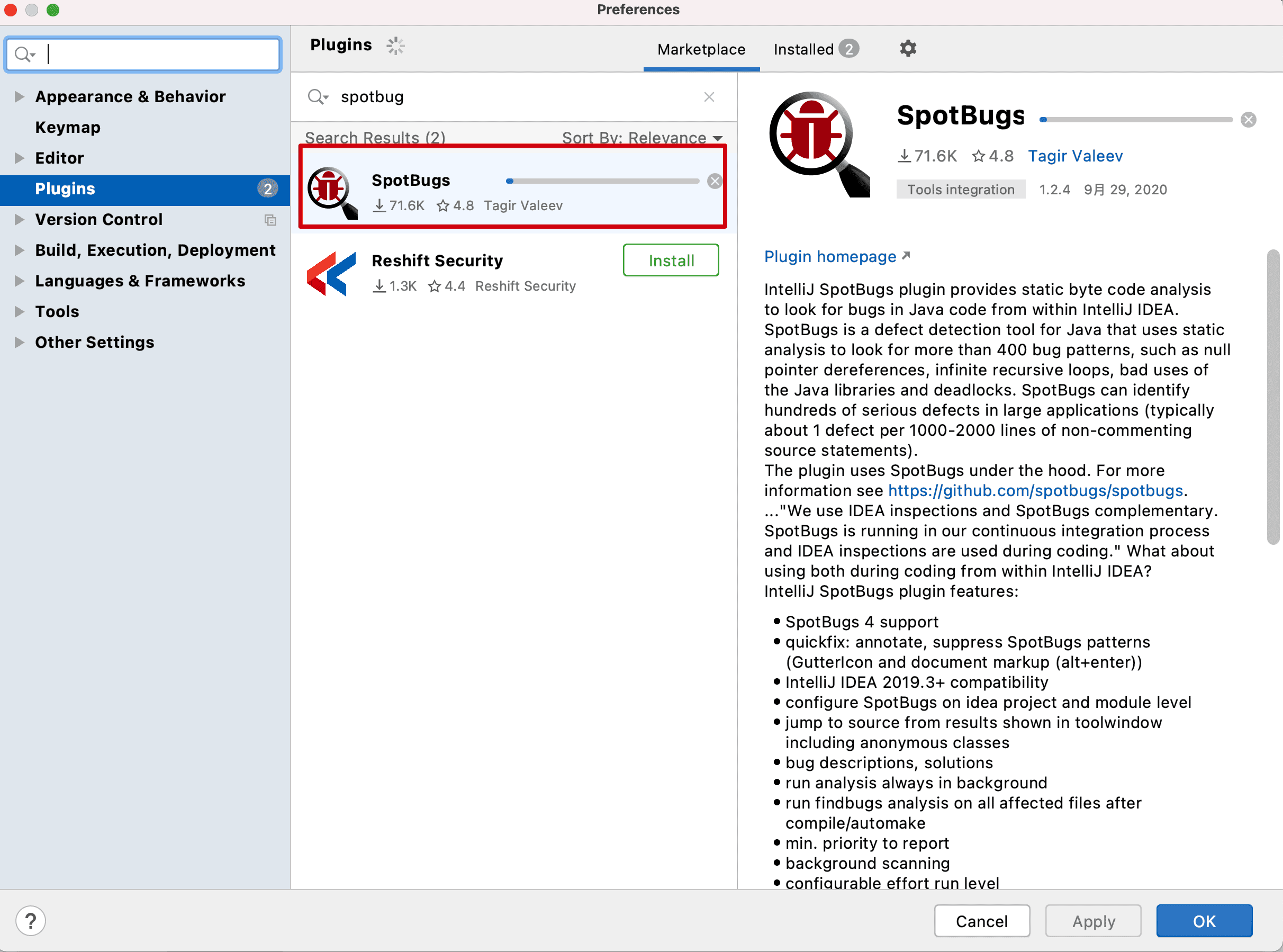 IntelliJ SpotBugs插件提供静态字节代码分析,以从IntelliJ IDEA中查找Java代码中的错误。SpotBugs是Java的缺陷检测工具,它使用静态分析来查找 400 多种错误模式,例如空指针取消引用,无限递归循环,对Java库的错误使用和死锁。SpotBugs可以识别大型应用程序中的数百个严重缺陷(通常每 1000-2000 行非注释源语句中大约有 1 个缺陷)。