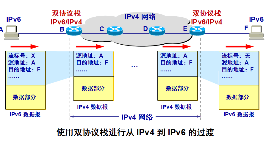 向 IPv6 过渡只能采用逐步演进的办法,同时,还必须使新安装的 IPv6 系统能够向后兼容:IPv6 系统必须能够接收和转发 IPv4 分组,并且能够为 IPv4 分组选择路由。