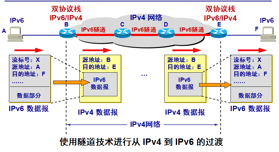 在 IPv6 数据报要进入IPv4网络时,把 IPv6 数据报封装成为 IPv4 数据报,整个的 IPv6 数据报变成了 IPv4 数据报的数据部分。 当 IPv4 数据报离开 IPv4 网络中的隧道时,再把数据部分(即原来的 IPv6 数据报)交给主机的 IPv6 协议栈。
