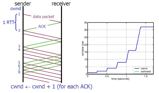 2)当每过一个RTT时,cwnd = cwnd + 1