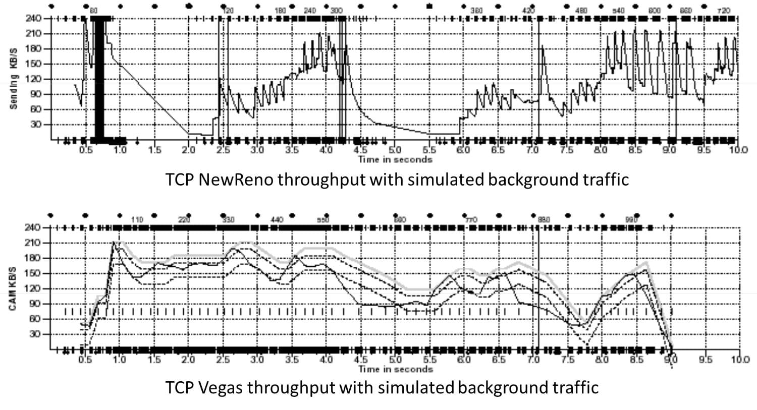 这个算法1994年被提出,它主要对TCP Reno 做了些修改。这个算法通过对RTT的非常重的监控来计算一个基准RTT。然后通过这个基准RTT来估计当前的网络实际带宽,如果实际带宽比我们的期望的带宽要小或是要多的活,那么就开始线性地减少或增加cwnd的大小。如果这个计算出来的RTT大于了Timeout后,那么,不等ack超时就直接重传。(Vegas 的核心思想是用RTT的值来影响拥塞窗口,而不是通过丢包) 这个算法的论文是《TCP Vegas: End to End Congestion Avoidance on a Global Internet》在新窗口打开这篇论文给了Vegas和 New Reno的对比: