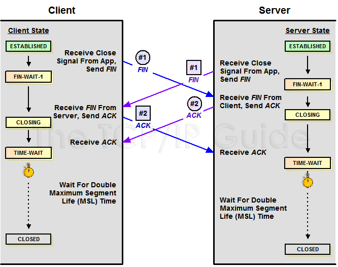 对于4次挥手 ,其实你仔细看是2次,因为TCP是全双工的,所以,发送方和接收方都需要Fin和Ack。只不过,有一方是被动的,所以看上去就成了所谓的4次挥手。如果两边同时断连接,那就会就进入到CLOSING状态,然后到达TIME_WAIT状态。下图是双方同时断连接的示意图(你同样可以对照着TCP状态机看):