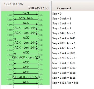 下图是我从Wireshark中截了个我在访问coolshell.cn时的有数据传输的图给你看一下,SeqNum是怎么变的。(使用Wireshark菜单中的Statistics ->Flow Graph… )