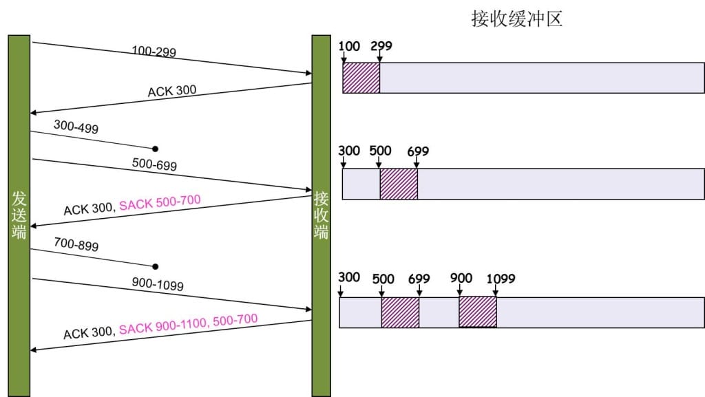 这里还需要注意一个问题——接收方Reneging,所谓Reneging的意思就是接收方有权把已经报给发送端SACK里的数据给丢了 。这样干是不被鼓励的,因为这个事会把问题复杂化了,但是,接收方这么做可能会有些极端情况,比如要把内存给别的更重要的东西。所以,发送方也不能完全依赖SACK,还是要依赖ACK,并维护Time-Out,如果后续的ACK没有增长,那么还是要把SACK的东西重传,另外,接收端这边永远不能把SACK的包标记为Ack 。