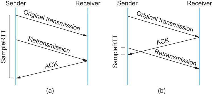 但是上面的这个算法在重传的时候会出有一个终极问题——你是用第一次发数据的时间和ack回来的时间做RTT样本值,还是用重传的时间和ACK回来的时间做RTT样本值?