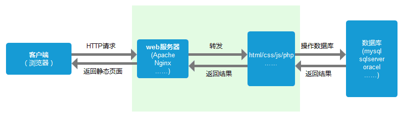 服务器端收到请求后的由web服务器(准确说应该是http服务器)处理请求,诸如Apache、Ngnix、IIS等。web服务器解析用户请求,知道了需要调度哪些资源文件,再通过相应的这些资源文件处理用户请求和参数,并调用数据库信息,最后将结果通过web服务器返回给浏览器客户端。