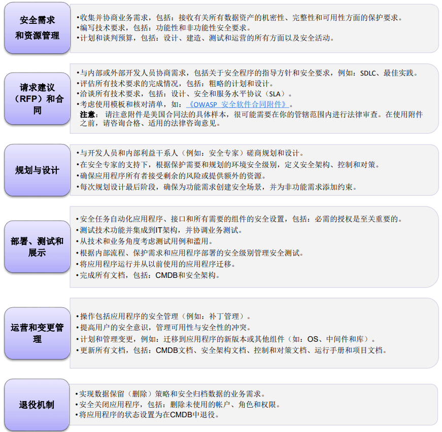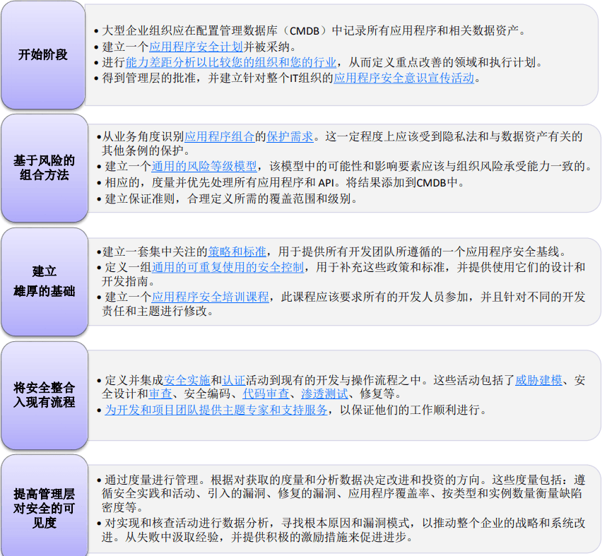 OWASP建议这些企业组织建立一个应用程序安全计划,深入了解并改善它们的应用程序组合的安全性。为了实现应用程序的安全性,需要企业组织中的不同部门之间有效地协同工作,这包括安全和审计、软件开发、商业和执行管理。安全应该可视化和可量化,让所有不同角色的人都可以看到并理解企业组织的应用程序的安全态势。通过消除或降低风险的方式专注于活动和结果,以帮助提高企业安全性。《OWASP SAMM》在新窗口打开和首席信息官的《OWASP应用安全指南》在新窗口打开是这个列表中大多数关键活动的来源。