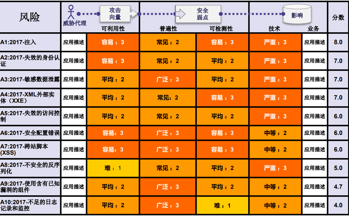 下面的表格总结了2017年版Top 10应用程序安全风险因素,以及我们赋予每个风险因素的风险值。这些因素基于OWASP团队拥有的统计数据和经验而决定。为了了解某个特定的应用程序或者企业组织的风险,您必须考虑您自己的威胁代理和业务影响。如果没有相应位置上的威胁代理去执行必要的攻击,或者产生的业务影响微不足道,那么就是再严重的软件漏洞也不会导致一个严重的安全风险。