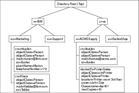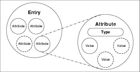 LDAP以目录信息树形式存储信息,包含入口、对象、属性,关系图如下: