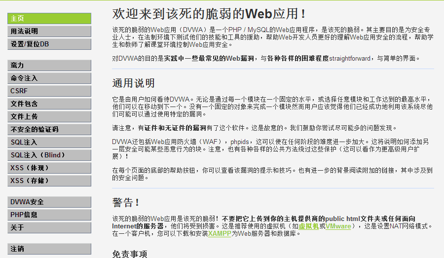 DVMA正如他的名字一样是一个包含了很多漏洞的应用系统。DVWA的漏洞包括了OWASP oepen web application security project的web 10大漏洞。DVWA里面具体包括如下这些漏洞: