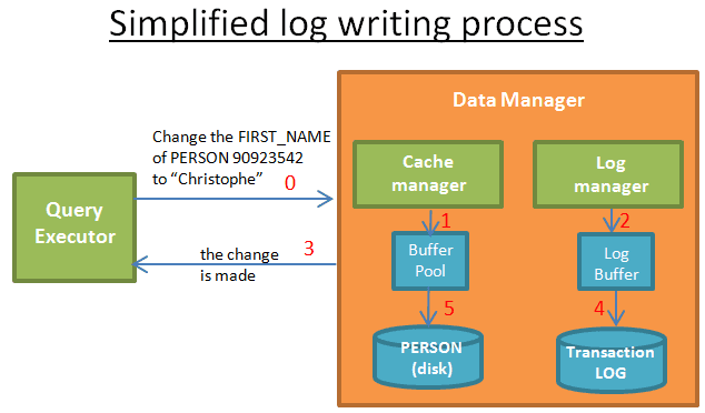 这个工作由日志管理器完成。简单的理解就是,日志管理器处于缓存管理器(cache manager)和数据访问管理器(data access manager,负责把数据写入磁盘)之间,每个 update / delete / create / commit / rollback 操作在写入磁盘之前先写入事务日志。这个过程并简单,原因在于如何找到写日志的同时保持良好的性能的方法 ,如果事务日志写得太慢,整体都会慢下来。