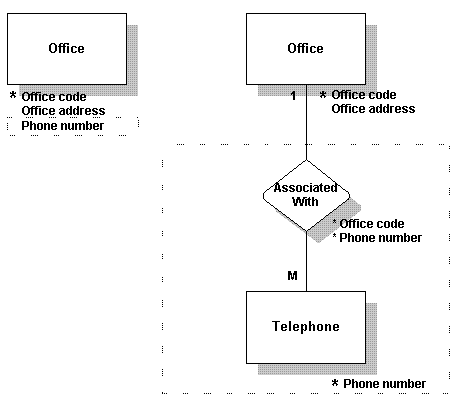 - 在下面的例子中,Phone Number可以重复。(一个工作人员可以有多于一个的电话号码。)将重复的组除去,创建一个名为Telephone的新表。在Telephone与Office创建一个名为Associated With的relationship。