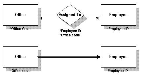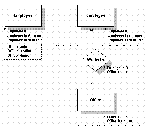 - 在此例中,原Employee表有依赖于其键(Employee ID)的数据。然而,office location及office phone依赖于其他字段,即Office Code。它们不直接依赖于Employee ID键。将这组数据,包括Office Code,移至一个名为Office的新表中,并为Employee及Office建立一个名为Works In的relationship。