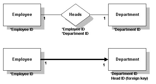 一对一 在一对一关系中,外部键可以放进任一表中。如果必须要放在某一边,而不能放在另一边,应该放在必须的一边。此例中,外部键(Head ID)在Department表中,因为这是必需的。