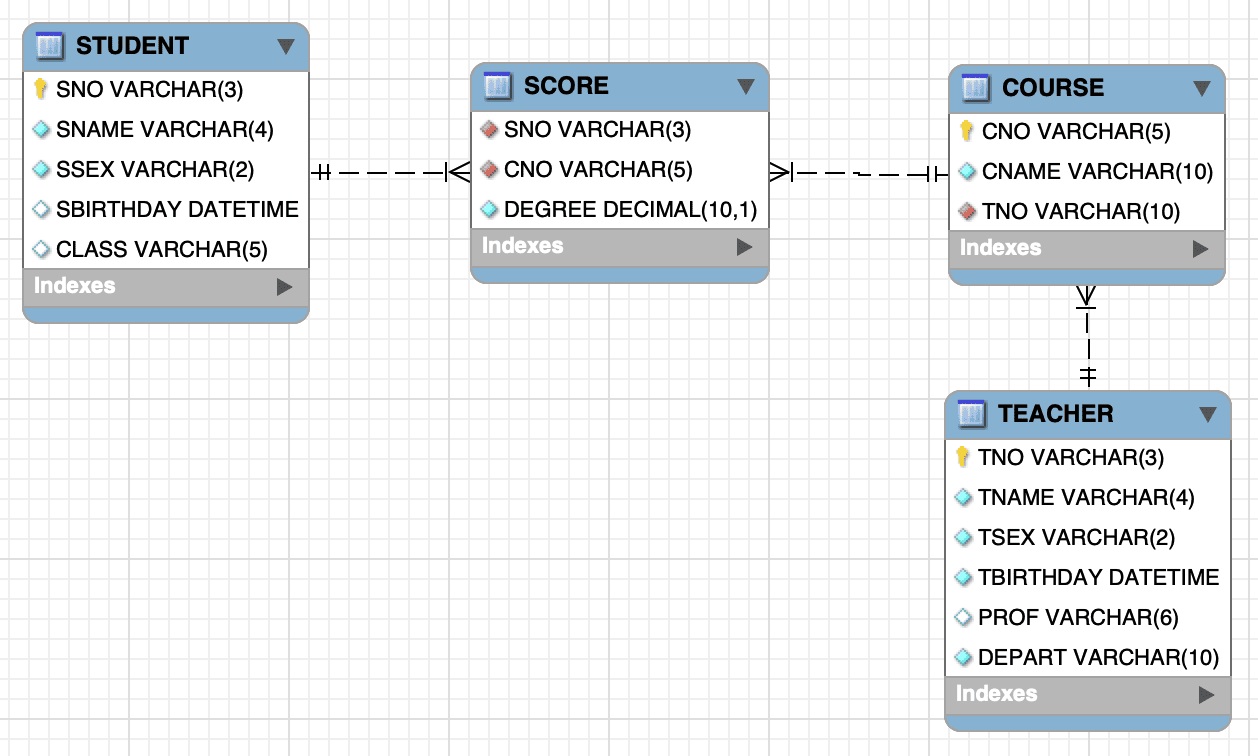 where STUDENT.SNO = SCORE.SNO;- 16、查询所有学生的Sname、Cname和Degree列。