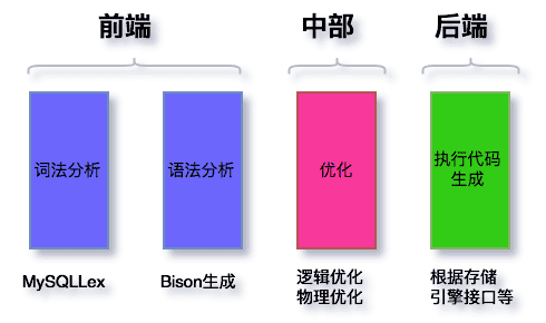 SQL解析与优化是属于编译器范畴,和C等其他语言的解析没有本质的区别。其中分为,词法分析、语法和语义分析、优化、执行代码生成。对应到MySQL的部分,如下图