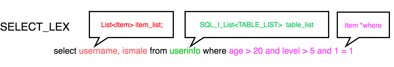 在SQL解析中,最核心的结构是SELECT_LEX,其定义在sql/sql_lex.h中。下面仅列出与上述例子相关的部分。