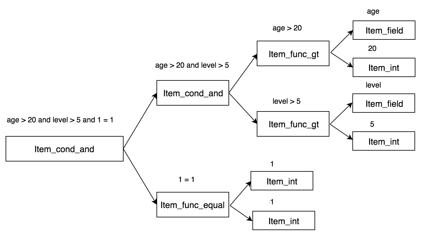 上面图示中,列名username、ismale存储在item_list中,表名存储在table_list中,条件存储在where中。其中以where条件中的Item层次结构最深,表达也较为复杂,如下图所示。