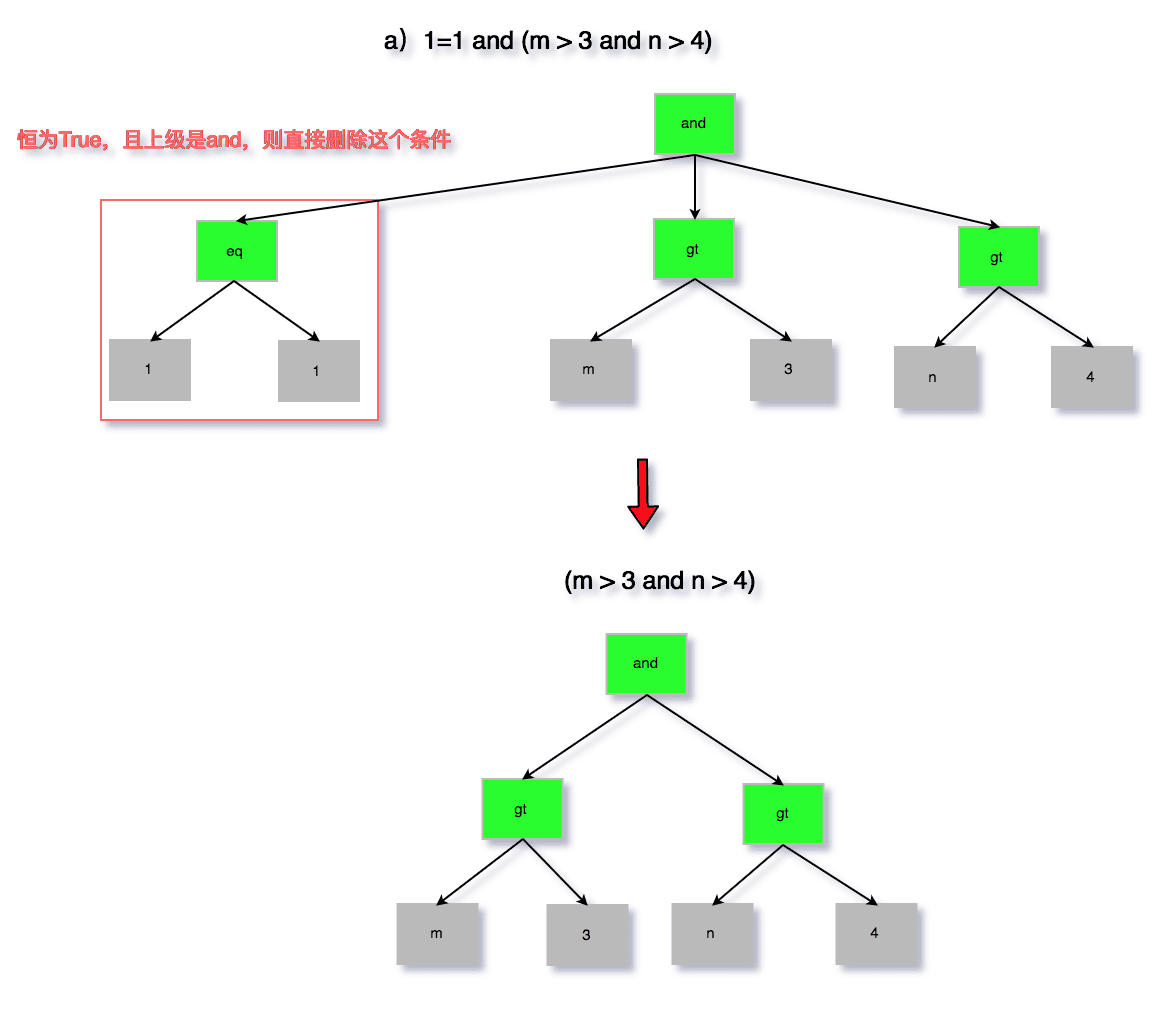 无用条件去除属于优化器的逻辑优化范畴,可以仅仅根据SQL本身以及表结构即可完成,其优化的情况也是较多的,代码在sql/sql_optimizer.cc文件中的remove_eq_conds函数。为了避免过于繁琐的描述,以及大段代码的粘贴,这里通过图来分析以下四种情况。