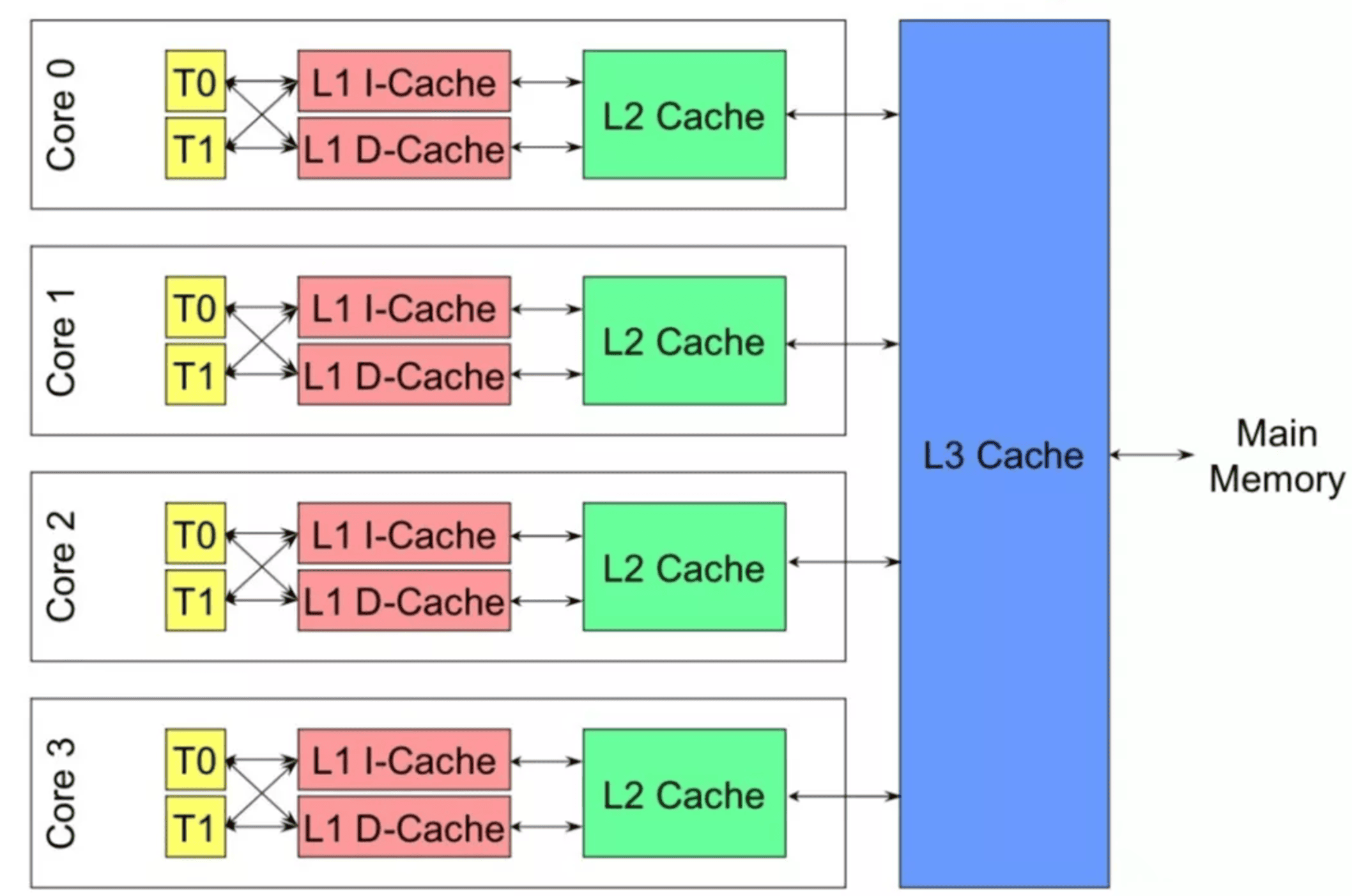 SMP 结构 :一个物理CPU可以有多个物理Core,每个Core又可以有多个硬件线程。即:每个HT有一个独立的L1 cache,同一个Core下的HT共享L2 cache,同一个物理CPU下的多个core共享L3 cache。
