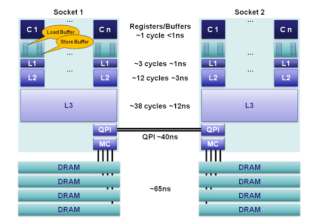 内存控制器芯片被集成到处理器内部,多个处理器通过QPI链路相连,DRAM也就有了远近之分。(如下图所示:摘自CPU Cache在新窗口打开)