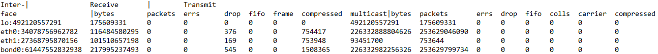 这个指标的数据源,是读取/proc/net/dev中的数据,监控Agent做简单的处理之后上报。以下为/proc/net/dev的一个示例,可以看到第一行Receive代表in,Transmit代表out,第二行即各个表头字段,再往后每一行代表一个网卡设备具体的值。