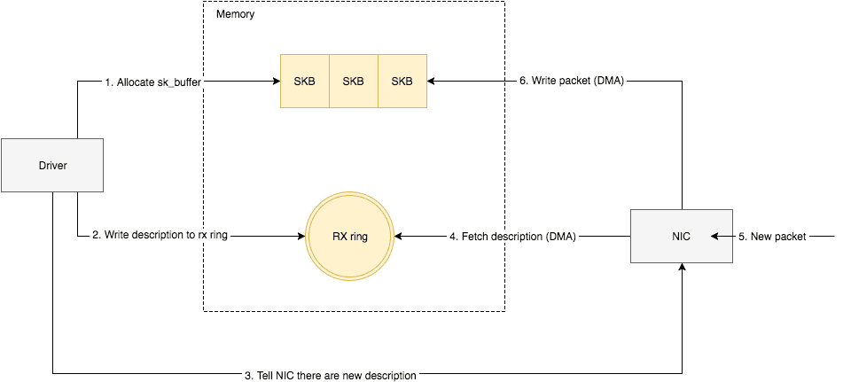 - 将网卡收到的数据包转移到主机内存(NIC与驱动交互)