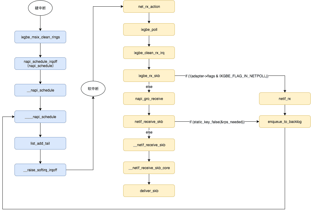 /usr/src/debug/kernel-2.6.32-431.20.3.el6/linux-2.6.32-431.20.3.el6.mt20161028.x86_64/net/core/dev.c:4013打开这个文件,我们发现它是在执行static void net_rx_action(struct softirq_action *h)这个函数,而这个函数正是前文提到的,NET_RX_SOFTIRQ对应的软中断处理程序。因此可以确认网卡的软中断在机器上分布非常不均,而且主要集中在CPU 0上。通过/proc/interrupts能确认硬中断集中在CPU 0上,因此软中断也都由CPU 0处理,如何优化网卡的中断成为了我们关注的重点。