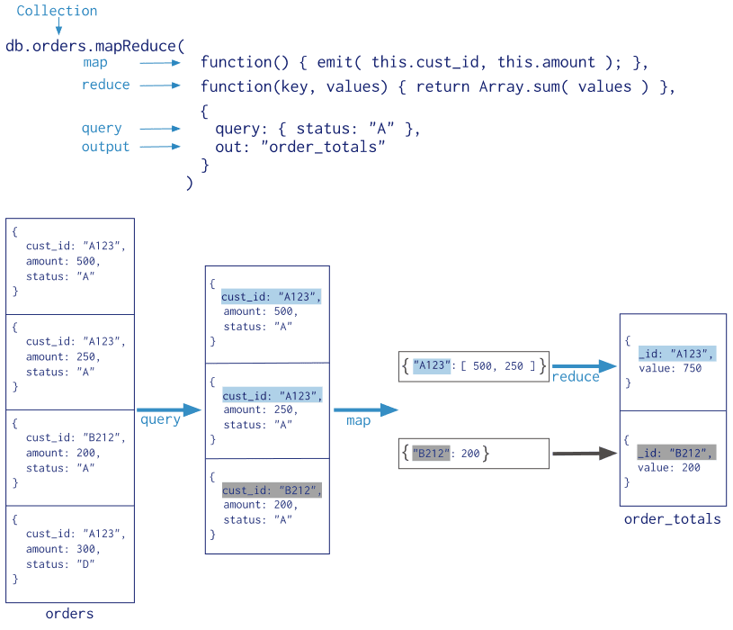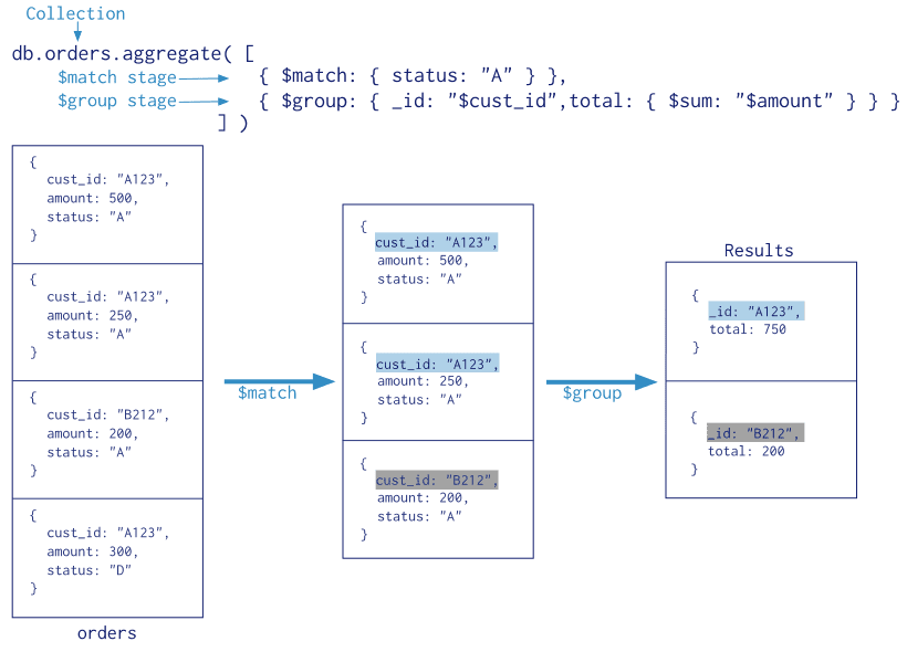 ... { _id: 1, cust_id: "abc1", ord_date: ISODate("2012-11-02T17:04:11.102Z"), status: "A", amount: 50 },