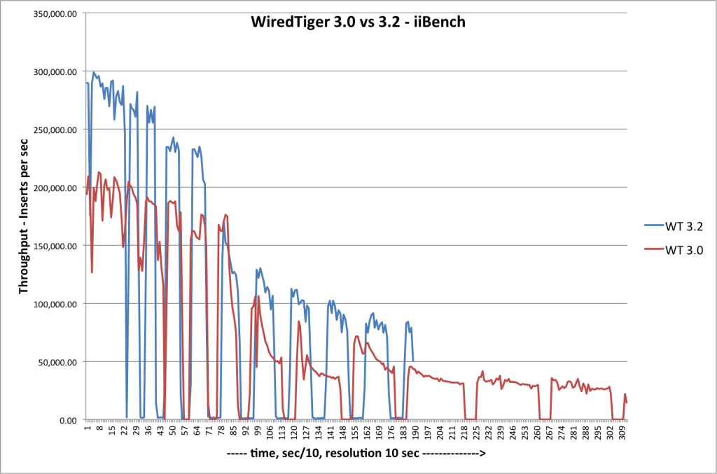 从mongoDB 3.0版本引入WiredTiger存储引擎(以下称为WT)以来,一直有同学反应在高速写入数据时WT引擎会间歇性写挂起,有时候写延迟达到了几十秒,这确实是个严重的问题。引起这类问题的关键在于WT的LRU cache的设计模型,WT在设计LRU cache时采用分段扫描标记和hazardpointer的淘汰机制,在WT内部称这种机制叫eviction cache或者WT cache,其设计目标是充分利用现代计算机超大内存容量来提高事务读写并发。在高速不间断写时内存操作是非常快的,但是内存中的数据最终必须写入到磁盘上,将页数据(page)由内存中写入磁盘上是需要写入时间,必定会和应用程序的高速不间断写产生竞争,这在任何数据库存储引擎都是无法避免的,只是由于WT利用大内存和写无锁的特性,让这种不平衡现象更加显著。下图是一位网名叫chszs同学对mongoDB 3.0和3.2版本测试高速写遇到的hang现象.