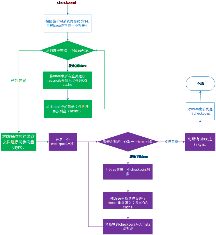 在上图的紫色是真正开始checkpoint事务的步骤,这里需要解释的是由于前面绿色步骤刷盘时间会比较长,在这个时间范围里会有新的写事务发生,也就意味着会新的脏页,checkpint必须把最新提交的事务修改落盘而且还要防止btree的分裂,这个时候就会获得btree的独占排他式访问 ,这时 eviction cache不能对这个btree上的页进行evict操作(在这种情况下是不是容易造成WT cache满而挂起读写事务?)。