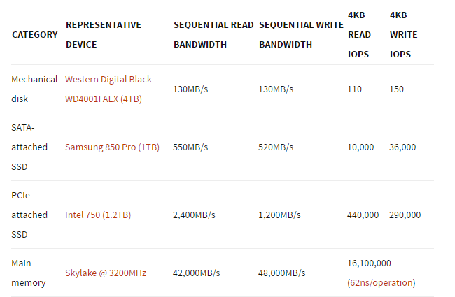从上图可以看出,SATA磁盘的顺序读写1MB数据大概需要8ms, SSD相对快一点,大概只需2ms.但内存的读写远远大于磁盘的速度。SATA的随机读取算一次I/O时间,大概在8ms 到10ms,SSD的随机读写时间比较快,大概0.1ms。