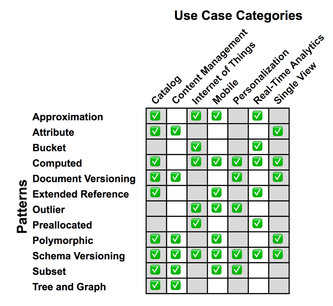 此外,正如应用场景示例中所看到的,我们可以将设计模式组合在一起以获得额外的性能提升。在本例中,将模式版本控制和属性模式一起使用,允许在不停机的情况下进行模式升级,这使得模式版本控制这一模式在MongoDB中特别强大。这很可能为你提供了一个充分的理由,让你在应用程序中使用MongoDB的文档模型而不是老式的表格数据库。