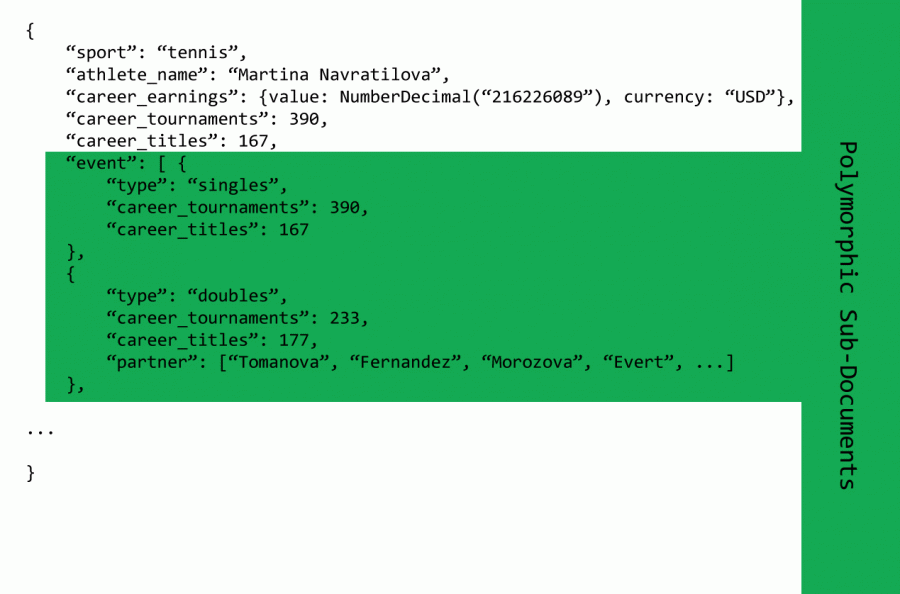 从应用程序开发的角度来看,当使用多态模式时,我们将查看文档或子文档中的特定字段,以便能够跟踪差异。例如,我们知道一个网球运动员可能参加不同的项目,而另一个运动员可能不参加。这通常需要应用程序基于给定文档中的信息选择不同的代码路径。或者,可能会编写不同的类或子类来处理网球、保龄球、足球和橄榄球运动员之间的差异。