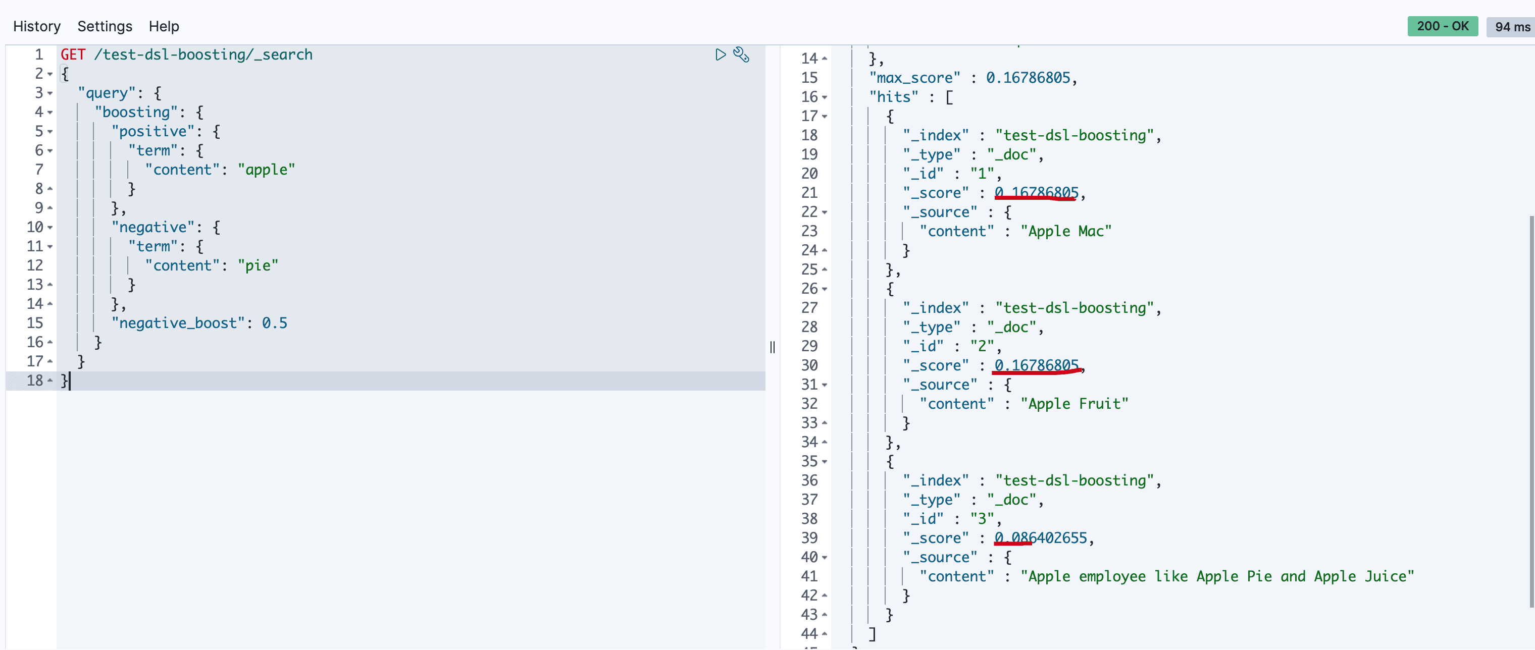 不同于bool查询,bool查询中只要一个子查询条件不匹配那么搜索的数据就不会出现。而boosting query则是降低显示的权重/优先级(即score)。