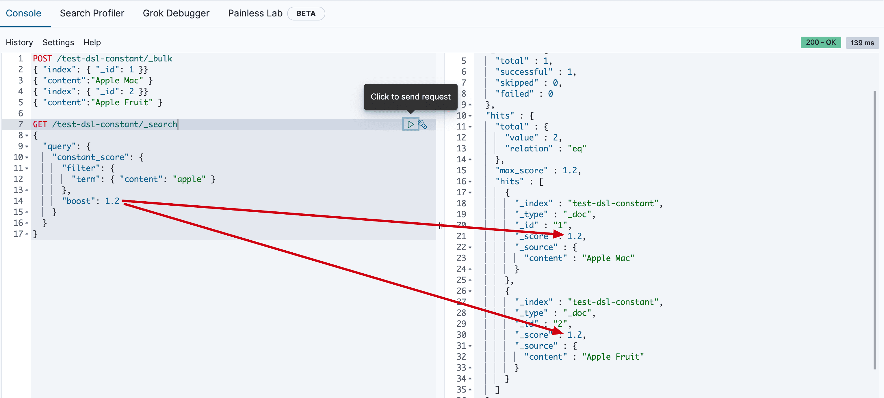 }在filter元素下指定的查询对评分没有影响 , 评分返回为0。分数仅受已指定查询的影响。