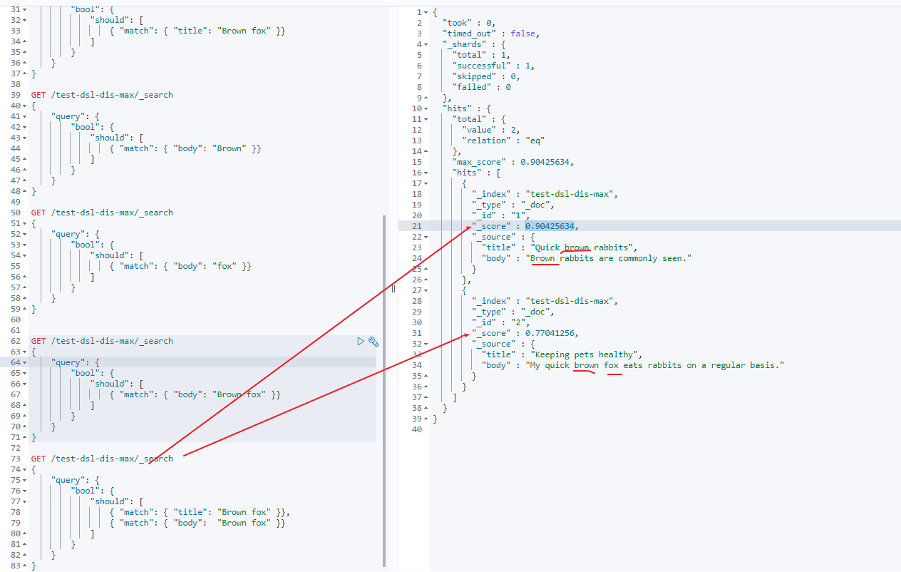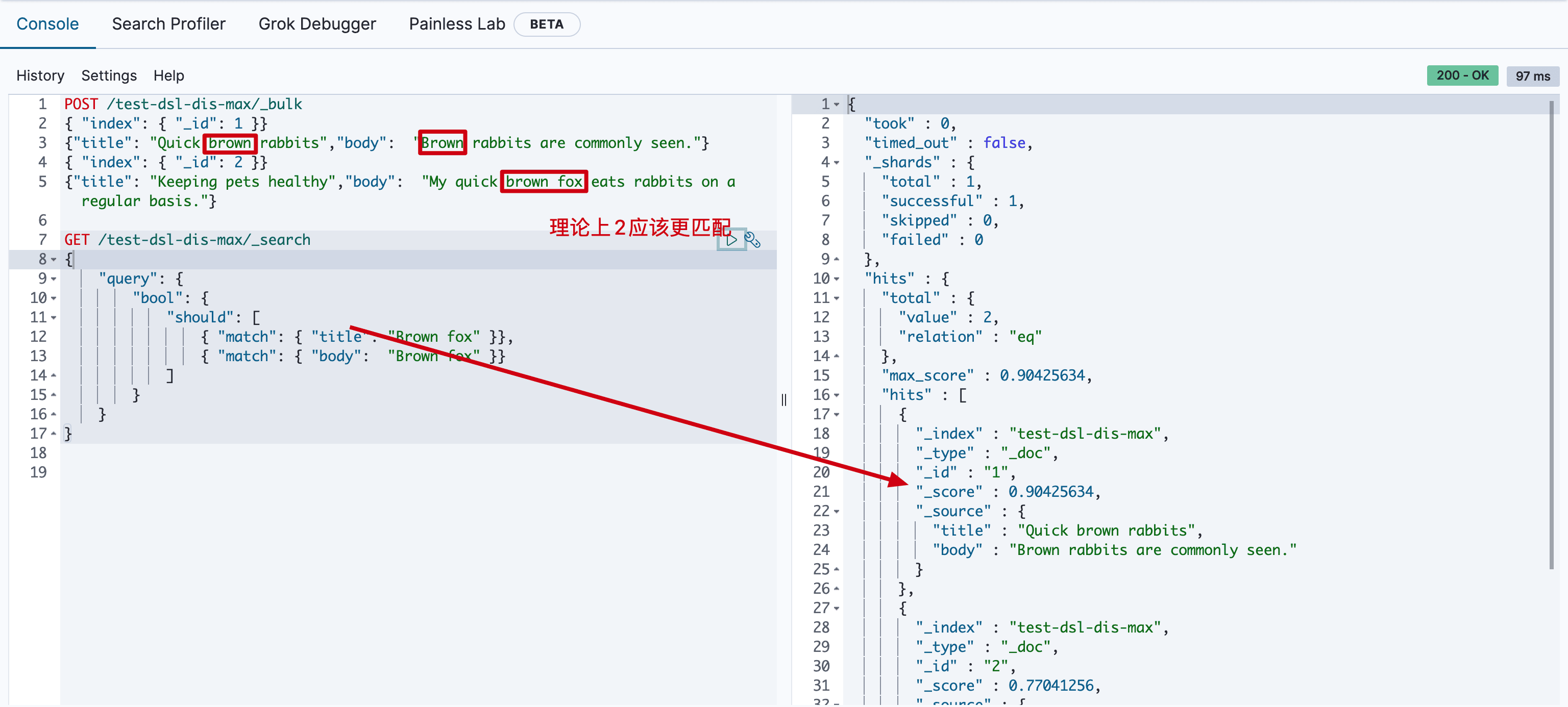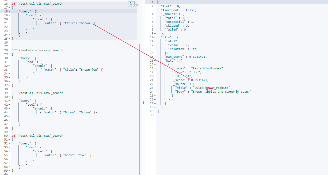 这样你就能理解通过dis_max将doc 2 置前了, 当然这里如果缺省tie_breaker字段的话默认就是0,你还可以设置它的比例(在0到1之间)来控制排名。(显然值为1时和should查询是一致的)