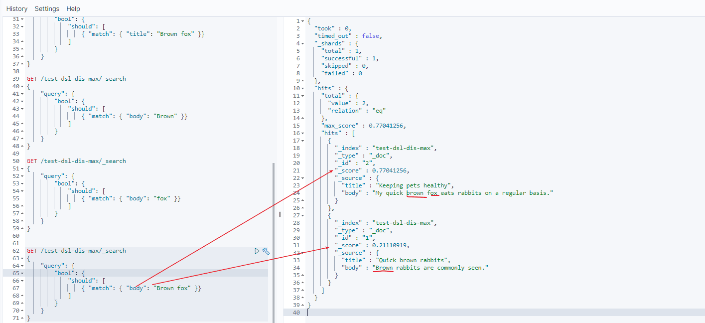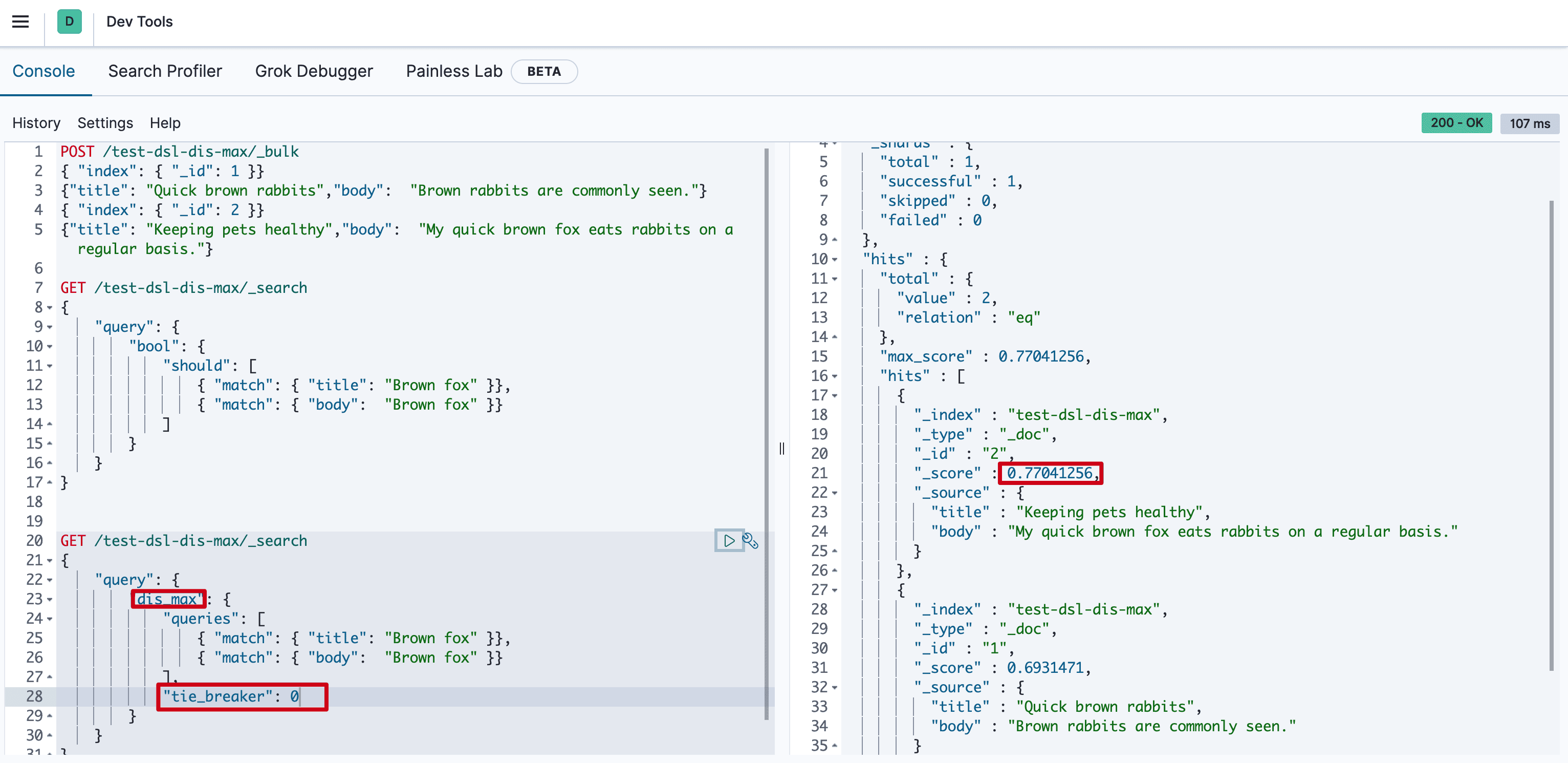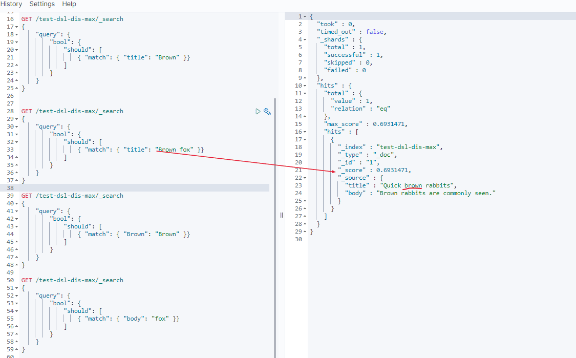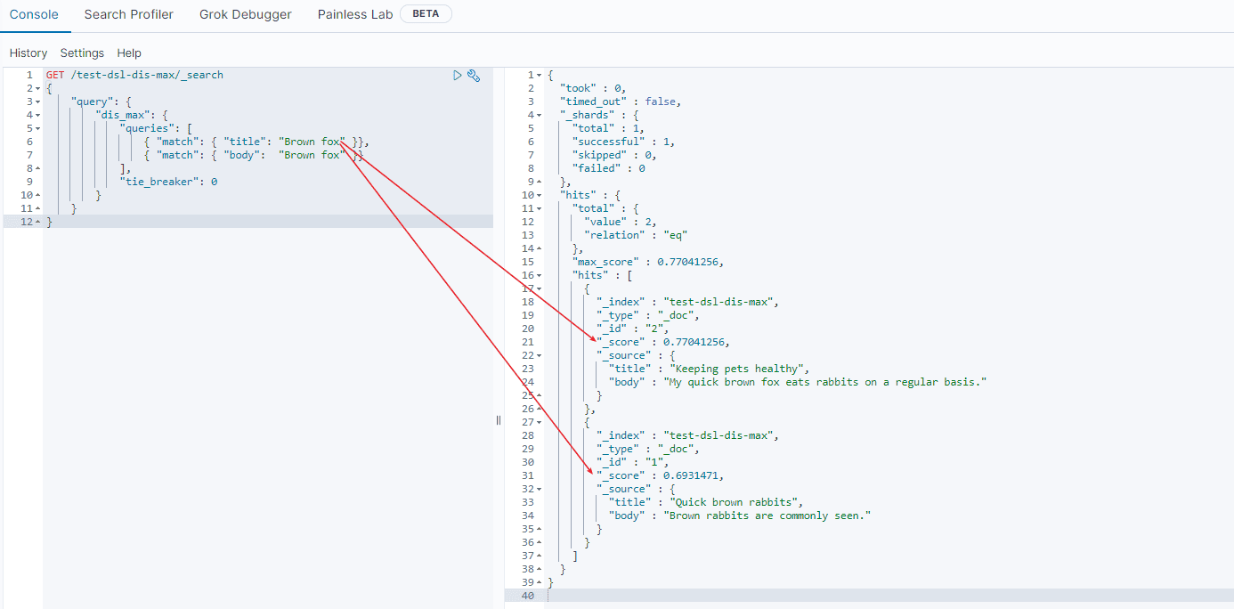 这样你就能理解通过dis_max将doc 2 置前了, 当然这里如果缺省tie_breaker字段的话默认就是0,你还可以设置它的比例(在0到1之间)来控制排名。(显然值为1时和should查询是一致的)